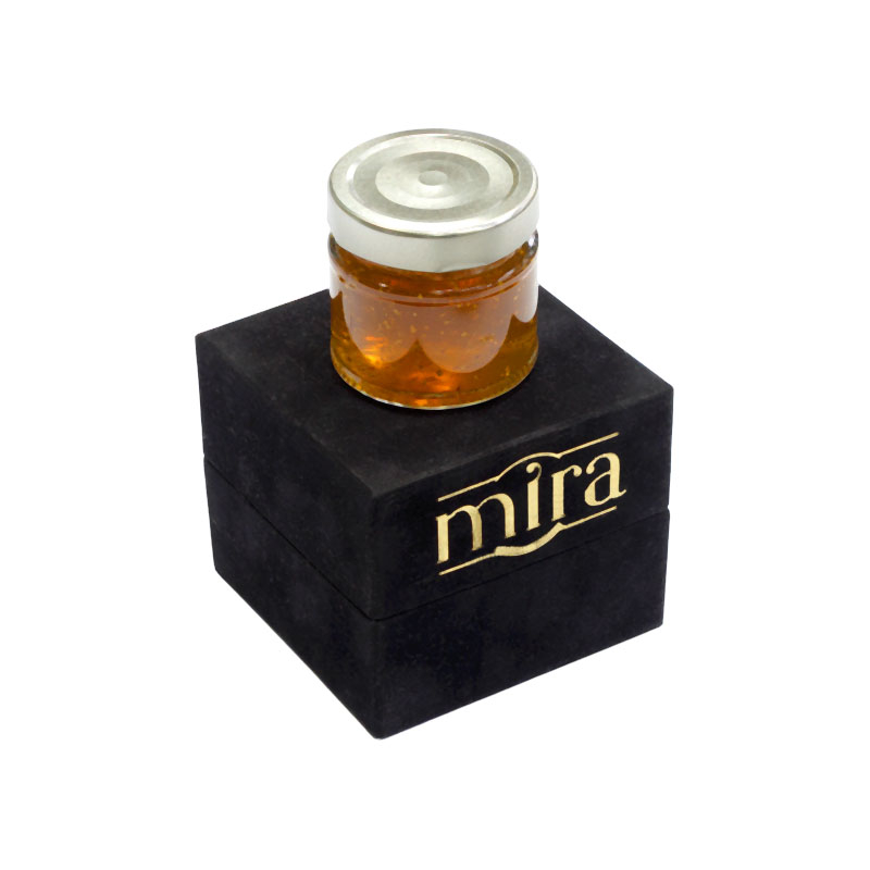 Caseta premium pentru prezentare produs, realizata integral din catifea, destinata ambalarii si prezentarii elegante a unui recipient din sticla pentru produse gourmet sau premium. Structura rigida si finisajul full catifea ofera o experienta vizuala si tactila premium, potrivita pentru branduri care inteleg valoarea detaliului.