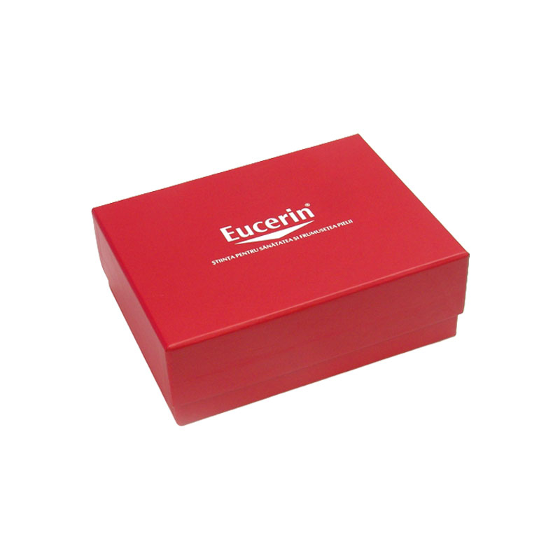 Cutie cu închidere telescopică, realizată din carton rigid, tipărită policromie și plastifiată mat, destinată ambalării și prezentării produselor în contexte comerciale și corporate.