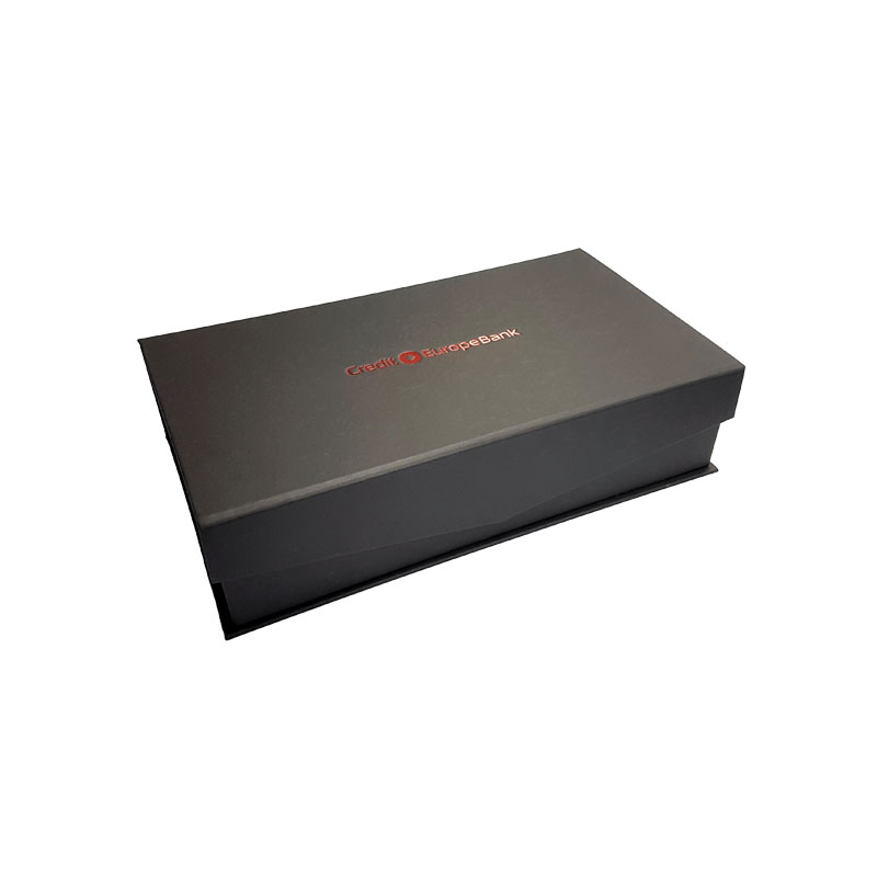 Cutie corporate din carton rigid, cu inchidere magnetica, realizata integral in productie proprie, personalizata cu folio, cu interior din burete stantat imbracat cu saten. Ofera sustinere precisa pentru produs si o prezentare premium, fiind potrivita pentru ambalare eleganta si proiecte corporate.