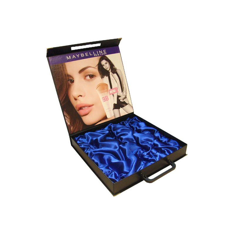 Cutie cu maner realizata din carton rigid, inchidere magnetica, conceputa pentru prezentarea si transportul elegant al produselor cosmetice. Exteriorul este finisat cu material tip imitatie piele, oferind un aspect premium si o rezistenta ridicata in utilizare. Interiorul este personalizat prin tipar policromie, iar produsul este fixat sigur intr-un suport din burete stantat, imbracat in saten, pentru protectie si impact vizual de lux.