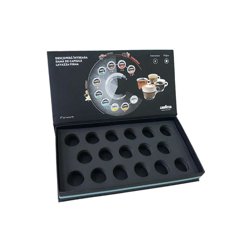 Cutie de prezentare realizata din carton rigid, cu inchidere tip carte, personalizare cu print UV si folio, conceputa special pentru capsule de cafea. Interiorul este din burete stantat, decupat individual pentru fiecare capsula, asigurand fixare perfecta, organizare clara si protectie in timpul manipularii.