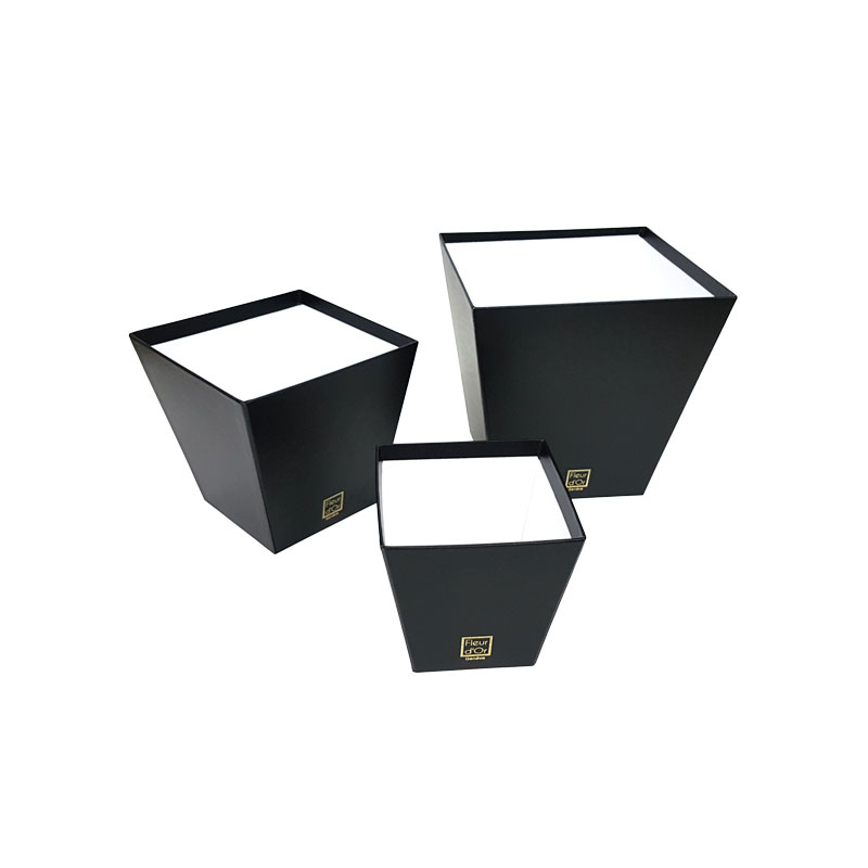 Cutie pentru flori din carton rigid, realizata in forma de trapez, imbracata in hartie neagra colorata in masa, cu finisaj elegant si structura solida. Designul geometric modern o diferentiaza clar de cutiile clasice rotunde sau patrate, fiind ideala pentru branduri care vor un ambalaj distinct.