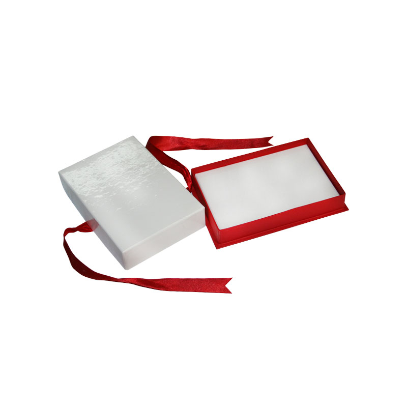 Cutie pentru bijuterii realizata din carton rigid, cu inchidere telescopica si funda decorativa, conceputa pentru prezentarea eleganta a diverselor tipuri de bijuterii. Exteriorul este finisat cu tipar plastifiat lucios, oferind un aspect rafinat si o protectie suplimentara impotriva uzurii.