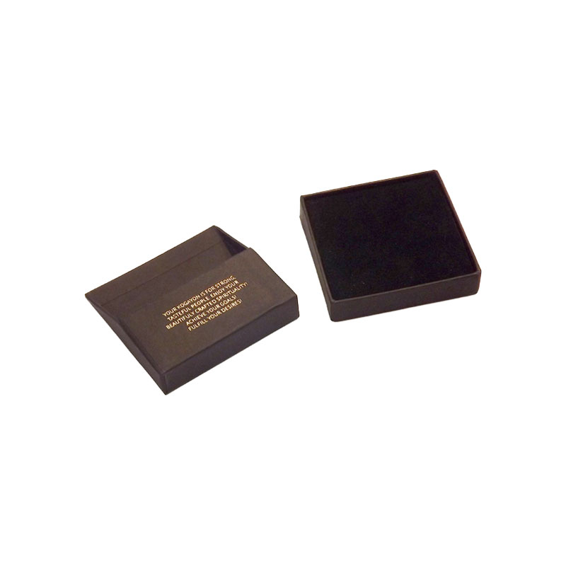 Cutie pentru bijuterii cu inchidere tip sertar, realizata din carton rigid, imbracata in hartie neagra colorata in masa, pentru un aspect uniform si premium atat la exterior, cat si la interior. Sistemul de deschidere tip sertar ofera o experienta placuta de utilizare si protejeaza continutul in mod eficient.