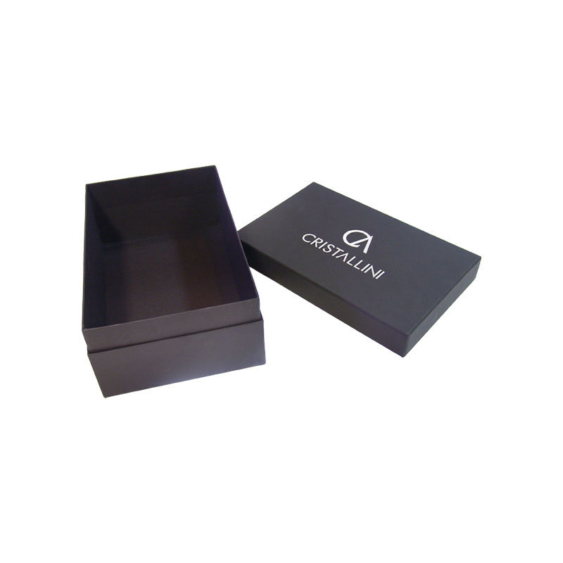 Cutia are inchidere cu gat, fiind formata din baza si capac separat, ceea ce permite o utilizare usoara si o prezentare curata. Exteriorul este imbracat cu hartie neagra speciala colorata in masa, putand fi personalizat cu folio pentru evidentierea brandului. Interiorul este simplu, din carton rigid, cu posibilitatea de adaptare in functie de dimensiunea si tipul incaltamintei.