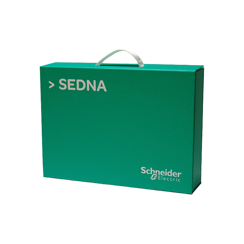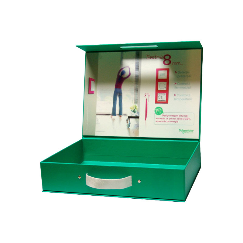 Cutie cu maner realizata din carton rigid, tiparita full policromie, conceputa pentru prezentarea profesionala a produselor in contexte corporate sau promotionale. Sistemul de inchidere cu clapa magnetica ofera siguranta la transport si o experienta premium la deschidere. Designul este solid, bine finisat, iar manerul aplicat permite manipulare usoara si transport confortabil.